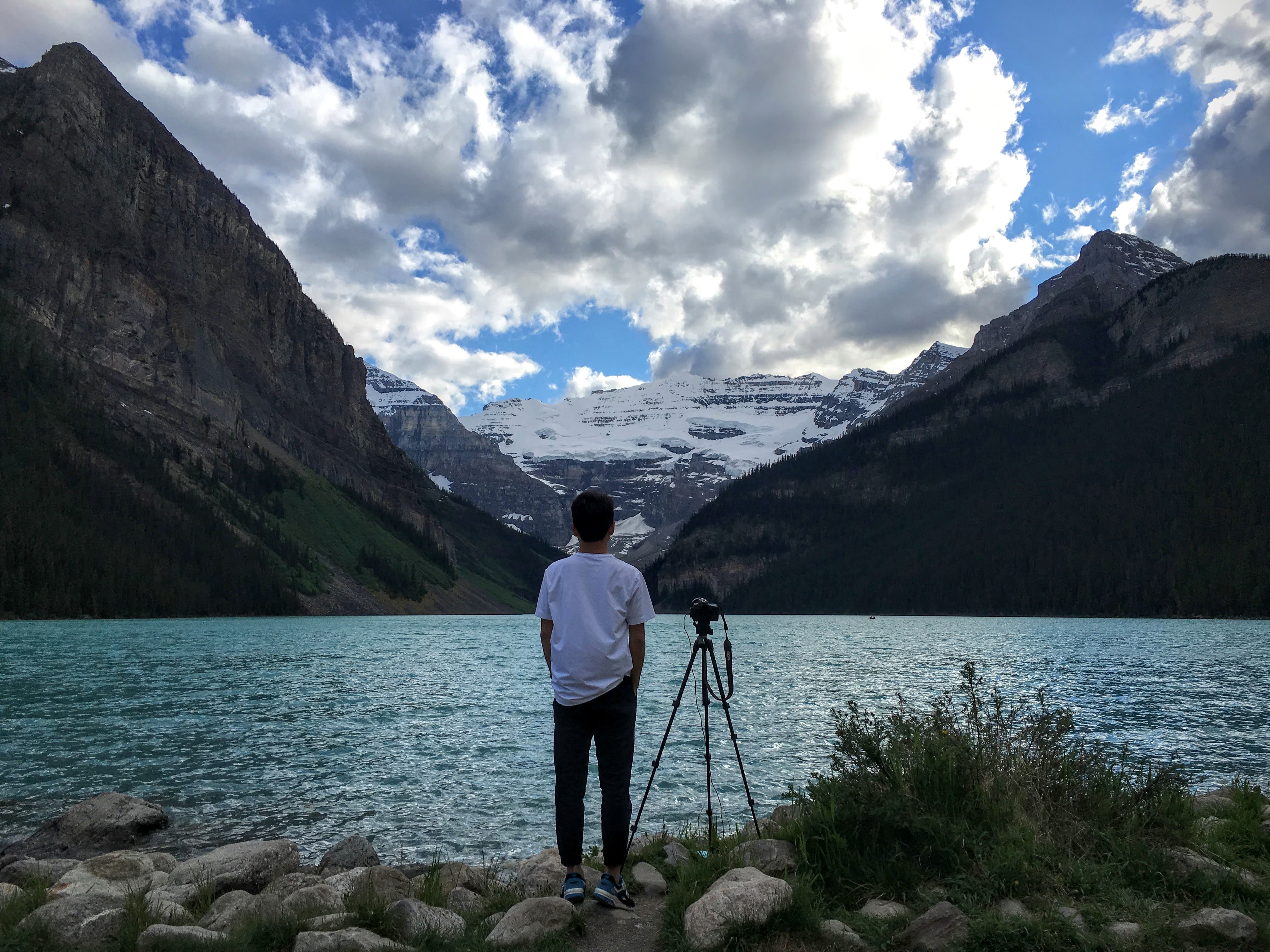 到达 Lake Louise,两个没见过什么世面的人纷纷发出了带着粗口的感叹。在最著名的观景区走了几圈后,选定拍照位置,就赶快在湖景饭店吃了一顿不错的晚饭,价格也合适。天公不作美,一整个晚上太阳都被云遮住了。直到九点多太阳即将下山,我们才决定打道回府。