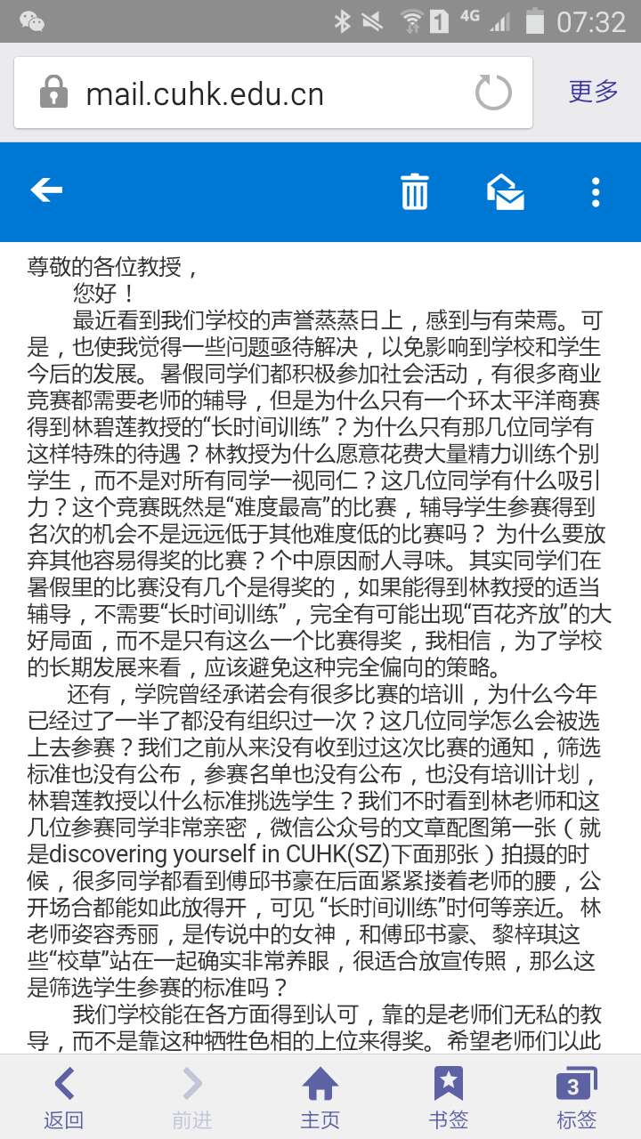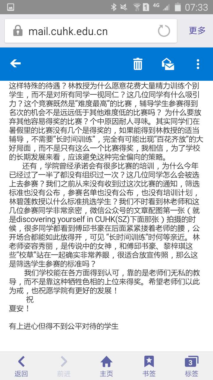 虽然说这个社会普遍存在这各种不公正的情况,但是我相信至少在我们校园里,一定是公正客观的(相较于这个社会而言)。邮件作者不仅给教授泼脏水,还给学校泼脏水。真是too young too simple。不要成天就想搞个大新闻。