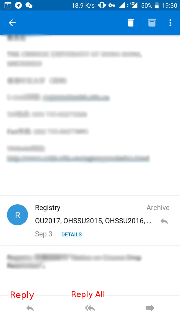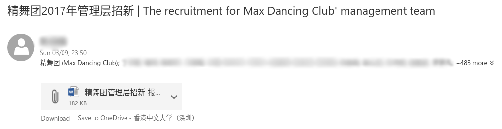 在邮件查看页面,Outlook 搞一个?是要干啥?然而重点是,这里的回复选项,默认是 Reply All!这就是说,如果你直接对一封社团群发的邮件点击这个默认的Reply All,你就会把你只需要回复给社团的邮件,同时回复给当时收到社团邮件(e.g. 招新宣传)的所有人!先不要笑,这种情况似乎还挺常见的:(点击图片可放大)