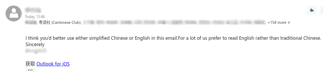 而上面这位同学回复给粤语社的邮件,Em…(注意图中的+154 more——这封邮件至少同时发给了150多个人,也许大家也看到了。为啥会发给这么多人?下面就讲)